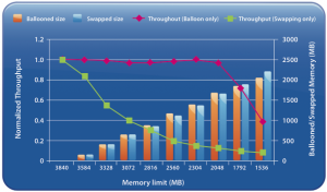 Results of two experiments are shown on this graph: in one memory is reclaimed only through ballooning and in the other memory is reclaimed only through host swapping. The bars show the amount of memory reclaimed by ESX and the line shows the workload performance. The steadily falling green line reveals a predictable deterioration of performance due to host swapping. The red line demonstrates that as the balloon driver inflates, kernel compile performance is unchanged. So the beauty of ballooning lies in the fact that it allows the guest OS itself to make the hard decision about which pages to be paged out without the hypervisor’s involvement. Because the Guest OS is fully aware of the memory state, the virtual machine will keep on performing as long as it has idle or free pages.