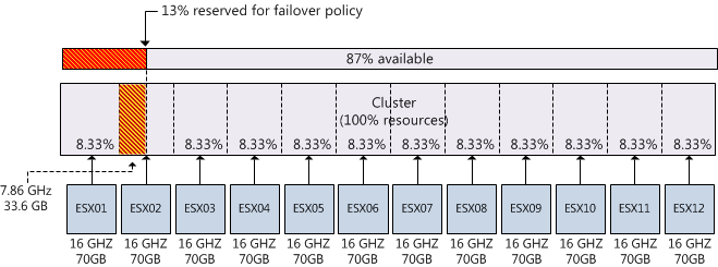 Aggressive approach I have seen recommendations about setting the percentage to a value that is less than the contribution of one host to the cluster. This approach reduces the amount of resources reserved for accommodating host failures and results in higher consolidation ratios. One might argue that this approach can work as most hosts are not fully loaded, however it eliminates the guarantee that after a failure all impacted virtual machines will be recovered. As datacenters are dynamic, operational procedures must be in place to -avoid or reduce- the impact of a self-inflicted denial of service. Virtual machine restart priorities must be monitored closely to guarantee that mission critical virtual machines will be restarted before virtual machine with a lower operational priority. If reservations are set at virtual machine level, it is necessary to recalculate the failover capacity percentage when virtual machines are added or removed to allow the virtual machine to power on and still preserve the aggressive setting. Expanding the cluster Although the percentage is dynamic and calculates capacity at a cluster-level, when expanding the cluster the contribution per host will decrease. If you decide to continue using the percentage setting after adding hosts to the cluster, the amount of reserved resources for a fail-over might not correspond with the contribution per host and as a result valuable resources are wasted. For example, when adding four hosts to an 8-host cluster while continue using the previously configured admission control policy value of 13% will result in a failover capacity that is equivalent to 1.5 hosts. The following diagram depicts a scenario where an 8 host cluster is expanded to 12 hosts; each with 8 2GHz cores and 70GB memory. The cluster was originally configured with admission control set to 13% which equals to 109.2 GB and 24.96 GHz. If the requirement is to be able to recover from 1 host failure 7,68Ghz and 33.6GB is “wasted”.
