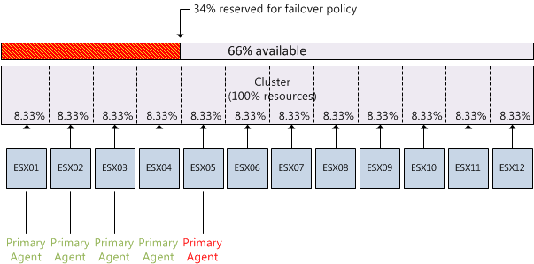 Although configuration of primary agents and configuration of the failover capacity percentage are non-related, they do impact each other. As cluster design focus on host placement and rely on host-level hardware redundancy to reduce this risk of failing all five primary nodes, admission control can play a crucial part by not allowing more virtual machines to be powered on while recovering from a maximum of four host node failure. This means that maximum allowed percentage needs to be calculated by summing the contribution per host x 4. For example the recommended maximum allowed configured failover capacity of a 12-host cluster is 34%, this will allow the cluster to reserve enough resources during a 4 host failure without over allocating resources that could be used for virtual machines.