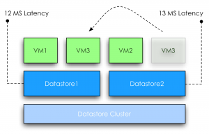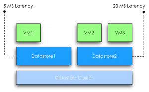 This article is a part of the series on architecture and design on datastore clusters. This article zooms in on why it’s recommended to use similar type disks in a datastore cluster. In-tier balancing solution SDRS can be considered as an “in-tier” balancing solution, suggesting that a datastore cluster should be populated with datastores that provide similar performance, continuity, capacity or service level. Although it’s not a technical requirement to have similar configured datastores, using heterogeneous configurations in a datastore cluster can lead to unexpected results. Understanding the SDRS’ main goal and the load balancing process can assist you in architecting your datastore cluster. SDRS load balancing goal The main focus of SDRS is to correct imbalance from both a space utilization and latency perspective on the datastore level. SDRS determines the imbalance level (space or latency) of the datastore cluster and migrates one or multiple virtual machine disk to solve the imbalance. In order to select an appropriate migration candidate (virtual machine) SDRS relies on device and workload modeling to understand the impact of a workload on the latency of the datastore, SDRS uses virtual machine statistics and datastore utilization to understand the impact of virtual machine placement on the space utilization of a datastore. Modeling Let’s take a closer look at modeling. SDRS captures device performance to create a performance model; by using the SIOC injector and a reference workload it understands and learns the performance of each device. This way SDRS gets a clear picture of the datastores inside the datastore cluster. Workload modeling is used by SDRS to understand and learn the virtual machine workloads inside the datastore cluster. The workload modeling process creates a workload metric of each virtual disk and analyzes the impact of the data points on latency. SDRS combines and correlates the outcome of device and workload modeling and space utilization into a unified recommendation. This means that when SDRS decides to migrate a specific VMDK, it considers the workload metric of the virtual disk and analyzes the impact of that specific workload on the latency of the destination datastore. If both IO metric and space utilization functions are enabled on the datastore cluster, SDRS combines the outcome of device modeling, workload modeling and space utilization and weights them regarding to violated threshold. Interesting enough, even when you disable IO load balancing, SDRS attempts to take overall IO statistics into account when finding a suitable datastore. Impact of load balancing construct on datastore cluster configuration Although SDRS analyzes devices and each virtual machines’ workload it’s is key to understand that SDRS’ main priority is to correct the threshold violation of datastore. Although it tries to find the best suitable datastore for a specific workload, modeling is still used as a metric to understand and achieve the goal of getting the best overall performance out of the datastore cluster. In other words, modeling is used for balancing the load on the datastores and not to respect specific wishes of a virtual machine disk. In one way you can argue that SDRS load balancing has somewhat of a socialistic nature. Benefit for the society (datastores inside a datastore cluster) outweighs the individual need (single virtual machine performance). Let’s look at an example to better understand this concept. Example scenario VM1 is running on a datastore1. SDRS determined that the normalized load* is 5ms latency. VM2 and VM3 are running on a datastore2. SDRS considers datastore2 to have a normalized load of 20ms latency, violating the default threshold of 15ms. Normalized load: SDRS aggregates the device modeling and workload modeling into a metric called normalized load.