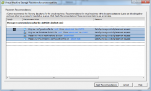 After analyzing the cost and benefit of the three search results Storage DRS will assign the highest goodness factor to the migration set of Datastore3. Although each search result can provide enough free space after moves, recommendation set of Datastore 3 will result in the lowest number of moves and migrates the lowest amount of data. All three results will be shown; the recommended set will be placed at the top A example placement recommendation screen is displayed, note that you can only apply the complete recommendation set. Applying the recommendation results in triggering the prerequisite migrations before the initial placement of the virtual machine occurs.