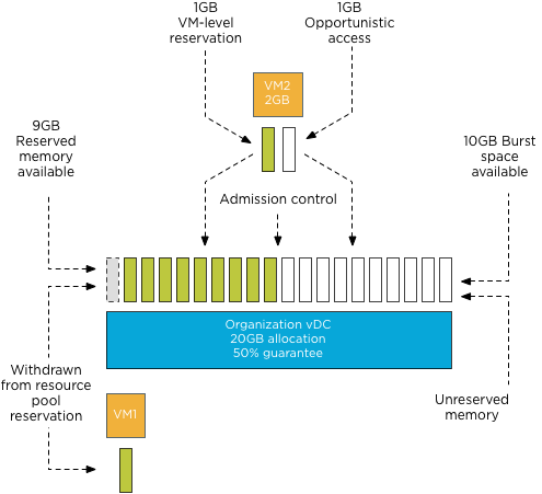 The previous article outlines the multiple admission controls active in a virtual infrastructure. One that always interested me in particular is the admission control feature that verifies resource availability. With the introduction of vCloud director another level of resource construct were introduced. Along with Provider virtual datacenter (vDC) and Organization vDCs, allocation models were introduced. An allocation model defines how resources are allocated from the provider vDC. An organization vDC must be configured with one of the following three allocation models: “Pay As You Go”, “Allocation Pool” and “Reservation Pool”. It is out of the scope to describe all three models, please visit Chris Colotti’s blog or Yellow Bricks to read more about allocation models. As mentioned before the distinction between each of the allocation models is how resources are consumed. Depending on the chosen allocation model reservations and limits will be set on resource pool, virtual machine level, or both. One of the most interesting allocation model is the Allocation Pool model as it sets reservations on both resource pool level and virtual machine level simultaneously. During configuration of the allocation pool model, an amount of guaranteed resources can be specified. (Guaranteed is the vCloud term for vSphere reservation). The question I was given is will lowering the default value of 100% guaranteed memory result in an increase of more virtual machines inside the Organization vCD? And the answer lies within the working of vSphere admission control. Allocation Pool model settings By default the Allocation Pool model sets a 100% memory reservation on both resource pool level and virtual machine level. By lowering the default guarantee, it allows for opportunistic memory allocation on both resource pool level and virtual machine level. Creating this burstable space (resources available for opportunistic access) usually provides an higher consolidation ratio of virtual machines, however due to the simultaneous configuration of reservation on both resource pool and virtual machine level, this is not the case. Virtual machine level reservation During power-on operation admission control checks if the resource pool can satisfy the virtual machine level reservation. Because expandable reservation is disabled in this model, the resource pool is not able to allocate any additional resources from the provider vDC. Therefor the virtual machine memory reservation can only be satisfied by the resource pool level reservation of the organization vDC itself. When a virtual machine is using memory protected by a virtual machine level reservation, this memory is withdrawn from the resource pool-level reservation. If the resource pool does not have enough available memory to guarantee the virtual machine reservation, the power-on operation fails. Let’s use a scenario to visualize the process a bit better. Scenario An organization vCD is created with the Allocation Pool model and the memory allocation is set to 20GB; the memory guarantee is set to 50%. These settings result in a resource pool memory limit of 20GB and a memory reservation of 10GB. When powering up a 2GB virtual machine, 1GB of reserved resources will be allocated to that virtual machine and withdrawn from the available reserved memory pool.