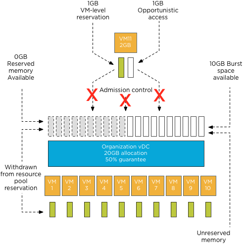 During each power-on operation 1GB of reserved memory is withdrawn from the reserved memory pool available to the organization vDC. Resulting in admission control allowing to power on ten virtual machines. When attempting to deploy virtual machine 11, admission controls fails the power-on operation as the organization vDC has no available reserved memory to satisfy the virtual machine level reservation.