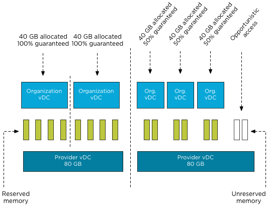 Note: This scenario excludes the impact of memory overhead reservation of each virtual machine. Under normal circumstances, the number of virtual machines that could be powered on would be close to 8 instead of 10 as the reserved pool available to the organization vDC is used to satisfy the memory overhead reservation of each virtual machine as well. Because the guarantee setting of the Allocation Pool model configures resource pool and virtual machine memory reservation settings simultaneously, the supply and demand of reserved memory resources are always equal regardless of the configured percentage setting. Therefore offering opportunistic access to resources inside the organization vDC does not allow an increase of the number of virtual machines inside the organization vDC. The next question arises, why should you lower the percentage of guaranteed resources? Providing burstable space increases the number of Organization vCDs inside the Provider vDC. Resource pool memory reservation Upon creation resource pools claim and withdraw the configured reserved resources from their parent instantaneously. This memory cannot be provided or distributed to other organization vDCs regardless of utilization of these resources.