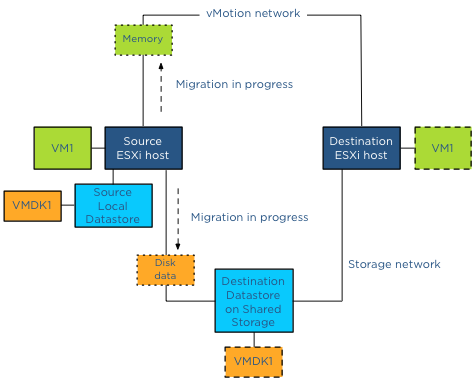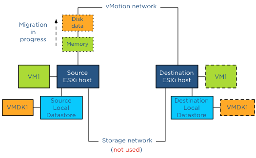 What is copied first, disk data or the memory state? If data is copied from non-shared datastores, vMotion must migrate the disk data and the memory across the vMotion network. It must also process additional changes that occur during the copy process. The challenge is to get to a point where the number of changed blocks and memory are so small that they can be copied over and switch over the virtual machine between the hosts before any new changes are made to either disk or memory. Usually the change rate of memory is much higher than the change rate of disk and therefore the vMotion process start of with the bulk copy of the disk data. After the bulk data process is completed and the mirror mode driver processes all ongoing changes, vMotion starts copying the memory state of the virtual machine. But what if I share datastores between hosts; can I still use this feature and leverage the storage network? Yes and this is very cool piece of code, to avoid overhead as much as possible, the storage network will be leveraged if both the source and destination host have access to the destination datastore. For instance, if a virtual machine resides on a local datastore and needs to be copied to a datastore located on a SAN, vMotion will use the storage network to which the source host is connected. In essence a Storage vMotion is used to avoid vMotion network utilization and additional host CPU cycles.