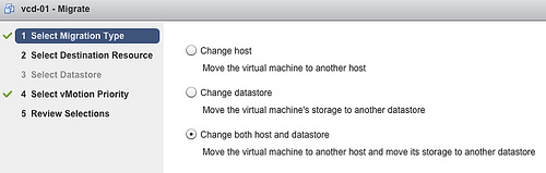 This may be obvious to most, but I just want to highlight it again. A Storage vMotion will never move the compute state of a VM to another host while migrating the data to another datastore. Therefore when you just want to move a VM to another host, select vMotion, when you only want to change datastores, select Storage vMotion. Which network will it use? vMotion will use the designated vMotion network to copy the compute state and the disks to the destination host when copying disk data between non-shared disks. This means that you need to the extra load into account when the disk data is being transferred. Luckily the vMotion team improved the vMotion stack to reduce the overhead as much as possible.