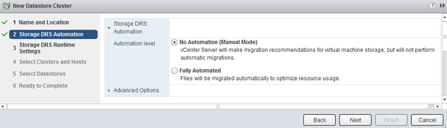 No Automation (Manual Mode) Manual mode is the default mode of operation. When the datastore cluster is operating in manual mode, placement and migration recommendations are presented to the user, but are not executed until they are manually approved. Fully Automated Fully automated allows Storage DRS to apply space and I/O load-balance migration recommendations automatically. No user intervention is required. However, initial placement recommendations still require user approval. Storage DRS allows virtual machines to have individual automation level settings that override datastore cluster-level automation level settings. Similar to when DRS was introduced, I recommend to start using manual mode first and review the generated recommendations. If you are comfortable with the decision matrix of Storage DRS you can switch to fully automated. Please note that you can switch between modes on the fly and without incurring downtime. 5. Storage DRS Runtime Settings