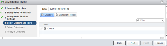 Keep the defaults for now. Future articles expand upon the Storage DRS thresholds and advanced options. 6. Select Clusters and Hosts The “Select Hosts and Clusters” view allows the user to select one or more (DRS) clusters to work with. Only clusters within the same vCenter datacenter can be selected, as the vCenter datacenter is the boundary for Storage DRS to operate in.