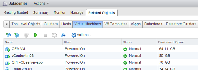 A VM storage profile is attached to a Storage capability. In turn a Storage Capability profile is attached to a datastore. For more information about storage capabilities please read the article: vSphere 5.0 Storage Features Part 11 – Profile Driven Storage by Cormac Hogan. 5. Go back to home 6. Select VM and Templates 7. Select Datacenter in the left pane 8. Select the menu option “Related Objects” in the right pane 9. Select the menu option “Virtual Machines”