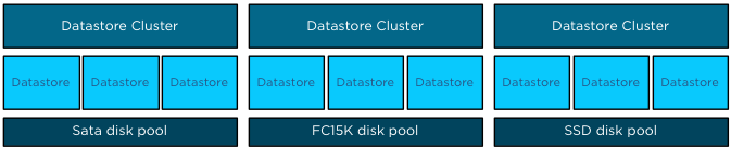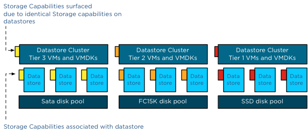 Datastores backed by disk out a single pool are aggregated into a single datastore, resulting in three datastore clusters. Having multiple datastore clusters can increase the complexity of the provisioning process, using VM storage profiles ensures you that virtual machines or disk files are placed in the correct datastore cluster. Assign storage capabilities to datastores All datastores within a single datastore cluster are associated with the same storage capability.