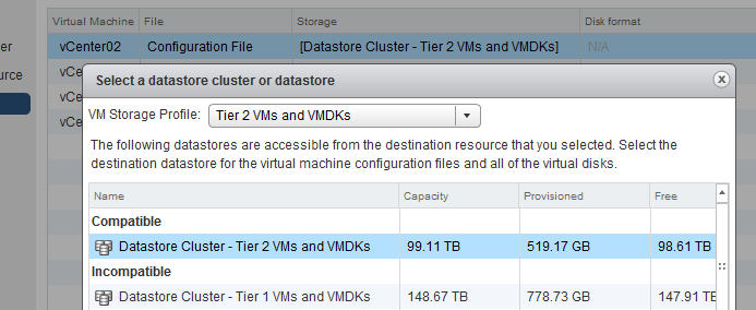 The VM storage Profile screen appears and you can select the appropriate VM storage profile. The VM storage profile “Tier 2 VMs and VMDKs” is selected and will be associated with the Configuration file once we click ok. As Tier 2 storage profile is associated with Storage Capability “FC 15K – Fast disks (Tier 2 VMs and VMDKs)”, the UI list “Datastore Cluster – Tier 2 VMs and VMDKs” as the only compatible datastore cluster.