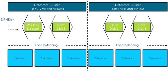 DRMDisks Storage DRS is able to generate these stand-alone recommendations due to the construct called DRMDisks. Storage DRS generates a construct called DRMDisk for each VM working directory and each VMDK. The DRMDisk is the smallest element Storage DRS can load balance (atomic level). Therefore Storage DRS can move a system disk VMDK to a different datastore in the datastore cluster without having to move the working directory or another disk. Depending on the default Affinity rule of the cluster, DRMdisks within the datastore cluster will be placed on the same datastore (affinity) or separated on different datastores (anti-affinity).