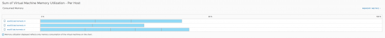 However since the active memory of each host is less than 20% and each virtual machine is receiving the memory they are entitled to, DRS will not move virtual machines around. Remember, DRS is designed to create as little overhead as possible. Moving one virtual machine to another host to make the active usage more balanced, is just a waste of compute cycles and network bandwidth. The virtual machines receive what they want to receive now, so why take the risk of moving VMs? But a different view of the current situation is when you toggle the graph to use consumed memory.