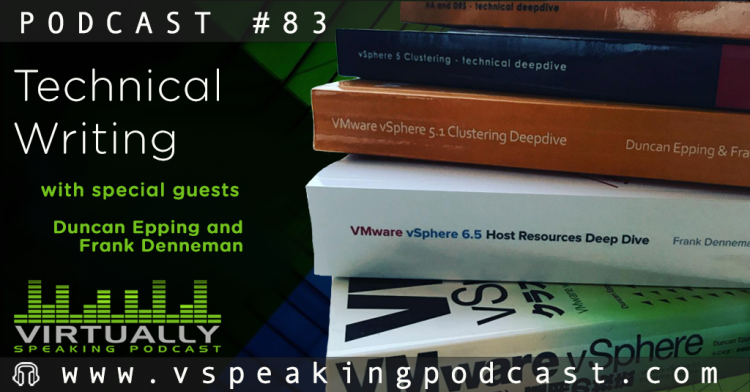 Last week Duncan and I were guests on the ever popular Virtually Speaking Podcast. In this show we discussed the difference in technical writing, i.e., writing a blog post versus writing a book. We spoke a lot about the challenges of writing a book and the importance of a supporting cast. We received a lot of great feedback on social media, and Pete told me the episode was downloaded more than a 1000 times in the first 24 hours. I think this is especially impressive as he published the podcast on a Saturday Afternoon. Due to this popularity, I thought it might be cool to share the episode in case you missed the announcement. Pete and John shared the links to our VMworld sessions on this page. During the show, I mentioned the VMworld session of Katarina Wagnerova and Mark Brookfield. If you go to VMworld, I would recommend attending this session. It’s always interesting to hear people talk about how they designed an environment and dealt with problems in a very isolated place on earth. Enjoy listening to the show.