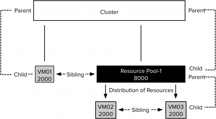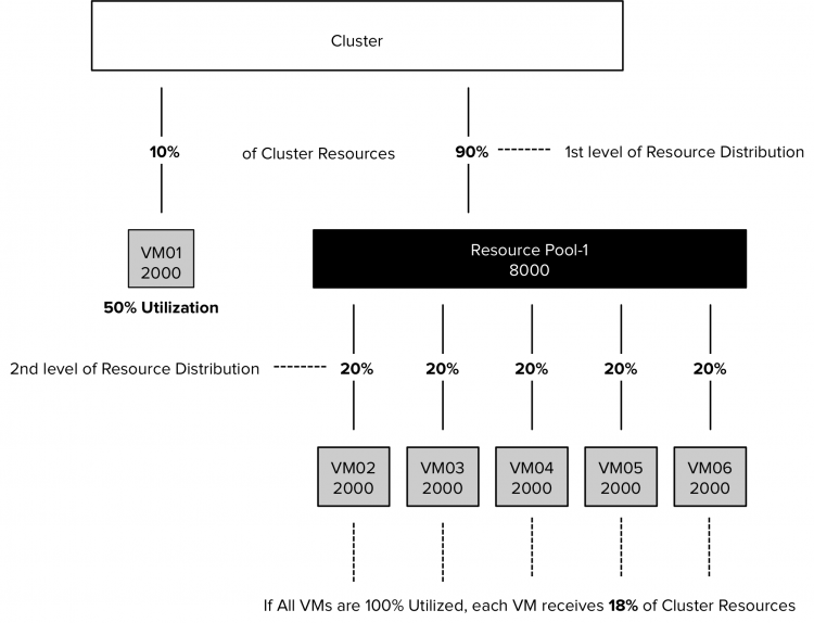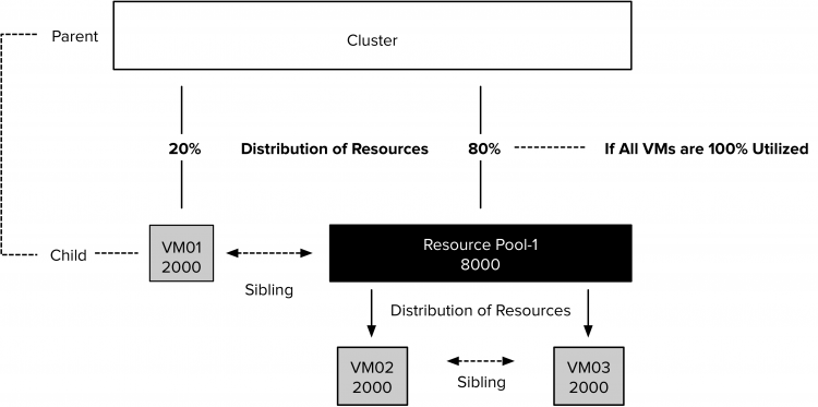 In the scenario depicted above, multiple sibling levels are present. VM01 and Resource Pool-1 are child objects of the cluster and therefore are on the same sibling level. VM02 and VM03 are child objects of Resource Pool-1. VM02 and VM03 are siblings, and both compete for resources provided by Resource Pool-1. DRS compares their share values to each other. The share values of VM01 and the other two VMs cannot be compared with each other because they each have different parents and thus do not experience sibling rivalry. Shares indicate the priority at that particular hierarchical level, but the relative priority of the parent at its level determines the availability of the total amount of resources. VM01 is a 2-vCPU 8GB virtual machine. The share value of Resource Pool-1 is set to high. As a result, the resource pool owns 8000 shares of CPU. The share value of VM01 is set to Normal and thus it owns 2000 CPU shares. Contention occurs, and the cluster distributes its resources between Resource Pool-1 and VM01. If both VM02 and VM03 are 100% utilized, Resource Pool-1 receives 80% of the cluster resources based on its share value.