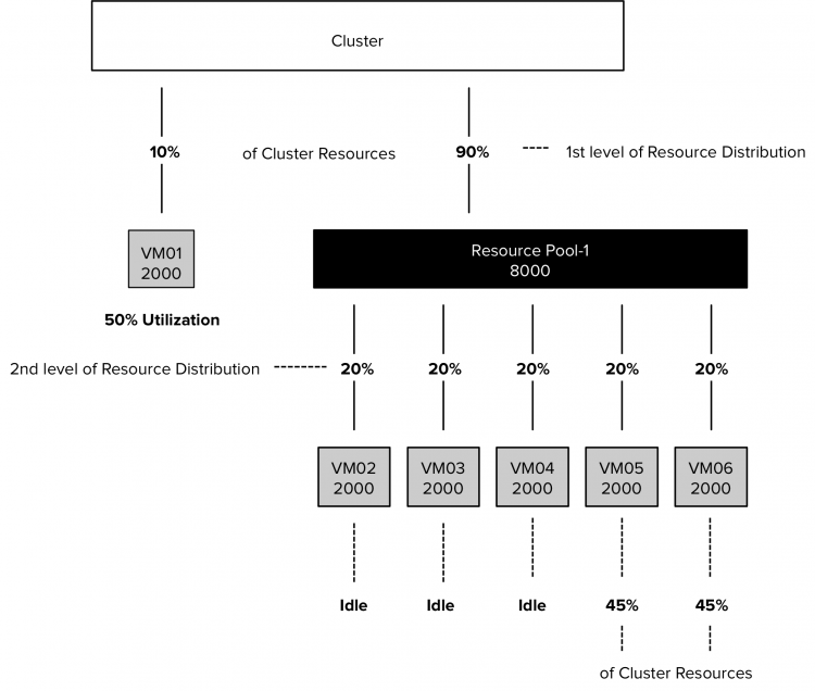 The distribution at the first level remains the same during contention. The cluster distributes its resources amongst its child-object, VM01 and Resource Pool-1; 20% to VM01 and 80% to Resource Pool-1. Please note this only occurs when all objects are generating 100% utilized. If VM01 was generating 50% of its load and the VMs in Resource Pool-1 are 100% utilized, the cluster would flow the unused resources to the resource pool to satisfy the demand of its child objects. The dynamic entitlement is adjusted to the actual demand. The VMs inside RP-1 are equally active, as a result of the reduced activity of VM01, they each receive 2% more resources.