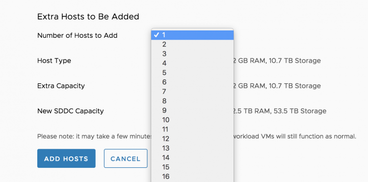 Please note that if you would select the default settings, you give EDRS the permission to scale up to 16 physical ESXi nodes. If this number of ESXi hosts is too high for you, please adjust the maximum cluster size. EDRS scales up per single node and evaluates the current workload, it uses a time window of 1 hour for evaluation. It does not add multiple hosts at once. Elastic DRS is designed to adjust to your workload dynamically, it responds to the current demand and scales in and out in a more fluid way. If you are aware of a high volume of incoming workload, you can add multiple hosts to the cluster swiftly by logging into the console, select the cluster to scale out and select add hosts.