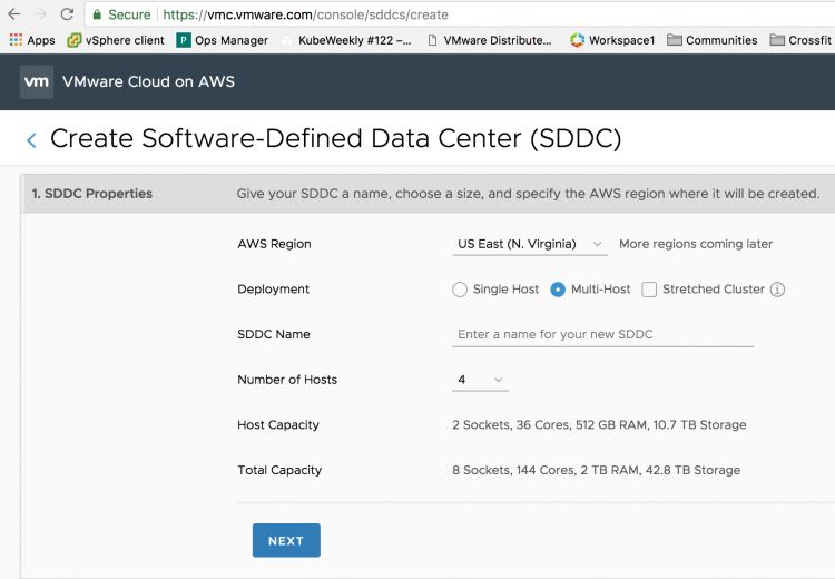 On one slide he mentions that the SDDC, that is the Software Defined Data Center provided by VMware Cloud on AWS (VMC) is not an SDDC out of the box. And to me, that sounds a bit weird. Let’s go over the process of spinning up an SDDC. First, you log onto vmc.vmware.com and you sign up for the service. In the console you define the number of hosts for deployment, click apply.