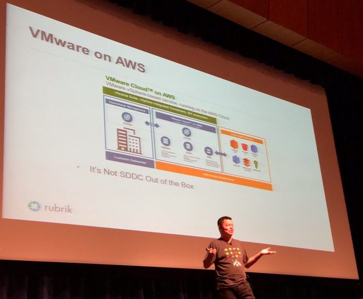 Yesterday, Kenneth Hui was on stage at the VTUG providing his personal opinion about VMware Cloud on AWS. The reason I say personal is that he forgot to remove the Rubrik Logo’s from his slide (I checked with Rubrik).