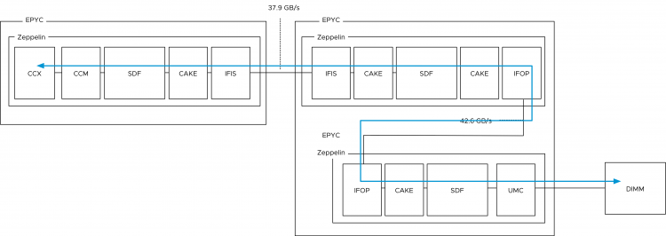 To be more precise, the IO traverses an additional component before hitting the IFOP. This component is called the Coherent AMD socKet Extender (CAKE). It facilitates die-to-die or socket-to-socket memory transactions. This module translates the request and response formats used by the SDF transport layer to and from the serialized format used by the IFOP. What that means is that a few extra hops and CPU cycles are introduced when fetching data stored within DIMMs attached to other Zeppelins on the same die. AMD reports a latency of ~145ns.