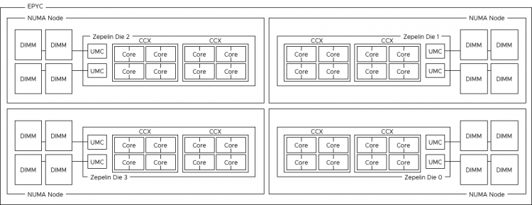 With the EPYC, every Zeppelin has two memory channels. Each memory channel can drive two DIMMs. For good performance, each Zeppelin should be equipped with at least 1 DPC. That means that a proper performing dual socket EPYC system should be configured with 16 DIMMs. This configuration allows for a theoretical bandwidth of 42.6 GB/s while providing a (shallow) memory capacity of just the two DIMMs combined. This design results in a single EPYC CPU package presents four NUMA nodes to the operating system. If the minimum of 1DPC is used, the NUMA node size can be too small and thus the overall performance if the VM memory size exceeds the physical memory configuration of each Zeppelin. Servethehome published some benchmark tests about the performance difference between the different memory configurations of EPYC.