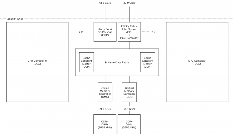 Each CCX is connected to the SDF through the Cache-Coherent Master (CCM) that is responsible for sending coherent data traffic cross CCXes. The SDF uses a Unified Memory Controller (UMC) to connect to DRAM memory modules. Each UMC provides a memory channel to two DIMMs. Providing the memory capacity of 4 DIMMs in total.
