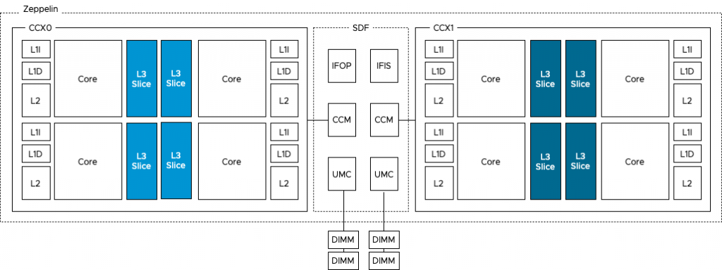 The photo above provides a clear overview of the structure of the CPU package. The Naples CPU package contains four Zeppelin dies (black rectangles). A Zeppelin die provides a maximum of eight Zen cores. The cores are divided across two compute complexes (CCX). A Zeppelin of a 32 core EPYC contains 4 cores per CCX. When Simultaneous Multi-Threading (SMT) is enabled, a CCX offers eight threads. Each CCX is connected to the Scalable Data Fabric (SDF) through the Cache-Coherent Master (CCM) that is responsible for sending traffic cross CCXes. The SDF contains two Unified Memory Controllers (UMC) connecting the DRAM memory modules. Each UMC provides a memory channel to two DIMMs. Providing the memory capacity of 4 DIMMs in total. Due to the combination of Cores, cache, and memory controller, a Zeppelin is a NUMA domain. To access a “remote” on-package memory controller, the Infinity Fabric On Package Controller (IFOP) sets up and coordinates the data communication.