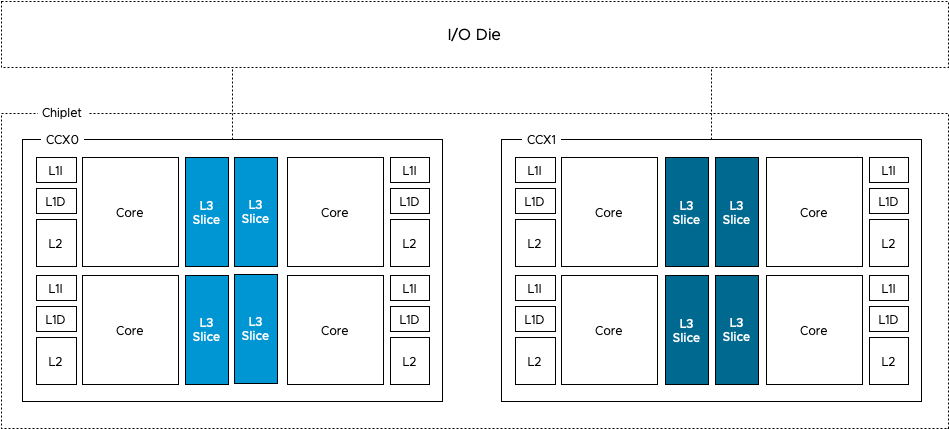 Back in the day when you could disable the cache of the CPU, someone tested the effect of cache on loading Windows 95. With cache it took almost five minutes, without the use of the cache, it took over an hour. Cache performance is crucial to get the best performance. And because of this, the vSphere NUMA scheduler and the CPU scheduler work together to optimize workloads that communicate with each other often. As they are communicating, they typically use the same data sources. Therefore, if vSphere can run the workload on the same cores that share the cache, then this could improve performance tremendously. The challenge is that AMD uses a different cache domain design than Intel.