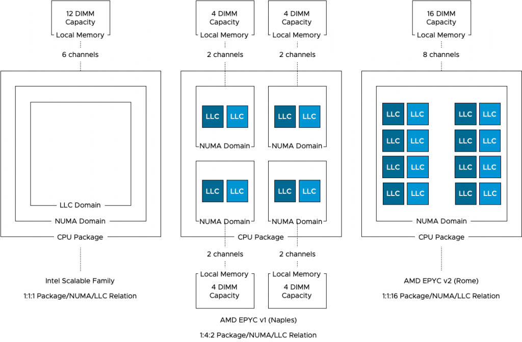 As mentioned before, a NUMA Domain, typically called NUMA node, is a combination of CPU cores, cache, and memory capacity connected to a local memory controller. Intel architecture design uses a single NUMA Domain per Socket (NPS), AMD Naples offered four NPS, while Rome is back to a single NPS. Single NPS simplifies VM and application sizing while providing the best and consistent performance.