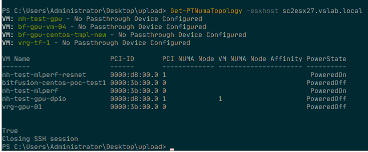 To make sense of it all, I created a simple PowerCLI module with two functions that show the VMs that have a passthrough device configured. The output shows the VM name and the PCI address of the device so that you can relate that to what you see in the UI. The next column shows the NUMA node to which the PCIe device is connected. The next column indicates whether the advanced setting numa.affinity is set for that particular VM and its value. The last column shows the power state of the VM. To set the NUMA affinity, the VM has to be powered off.