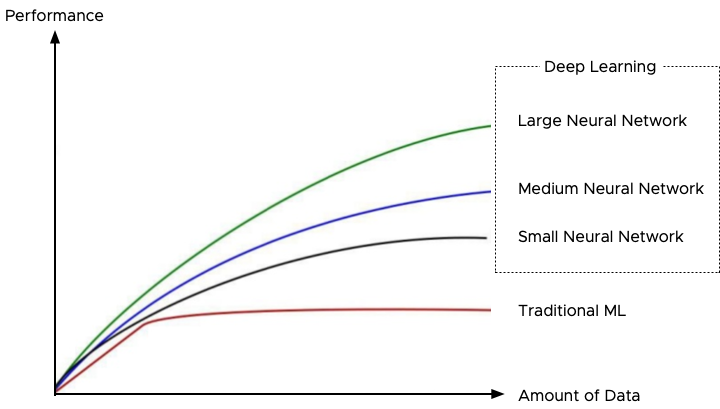 Interestingly, at one point, ML experiences a performance plateau regardless of the amount of incoming new data, while deep learning keeps on improving. For more information, about this phenomenon review the notes from Andrew Ng Coursera Deep Learning course or watch his 5-minute clip on youtube: How Scale is Enabling Deep Learning.