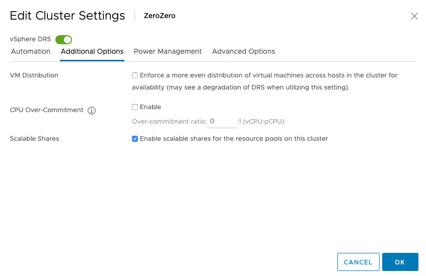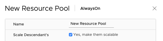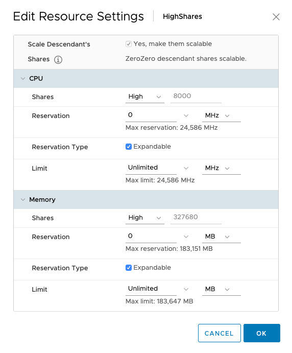 It’s easier to enable it at the cluster level as each child-RP automatically inherits the scalable shares functionality. You can also leave it “unticked” at the cluster level, and enable the scalable shares on each individual resource pool. The share value of each RP in that specific resource pool is automatically adjusted. Setting it at this level is pretty much intended for service providers as they want to carve up the cluster at top-level and assign static portions to customers while providing a self-service IAAS layer beneath it.