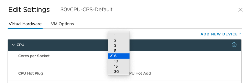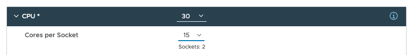 The Cores per Socket setting is invented to solve a licensing problem. There are small performance gains to be made if the application is sensitive to cache performance and can keep the data in the physical cache. If you have that application, please align your Cores per Socket setting to the actual physical layout. Using the last example, for the 30 vCPU VM on a dual-socket 40 cores host, the Cores per Socket should be 15, resulting in 2 virtual sockets.