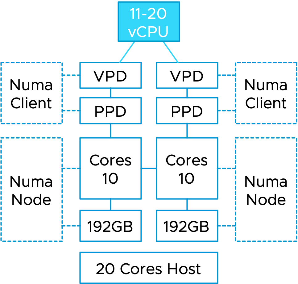 As depicted in the diagram, this VM runs on a dual-socket ESXi host. Each CPU socket contains a CPU package with 10 CPU cores. If this VM gets configured with a vCPU range between 11 and 20 vCPUs, the NUMA scheduler creates two NUMA clients and distributes these vCPUs evenly across the two NUMA nodes. The guest OS is presented with a virtual NUMA topology by the VPDs that aligns with the physical layout. In other words, there will be two NUMA nodes, with an x number of CPUs inside that NUMA node.