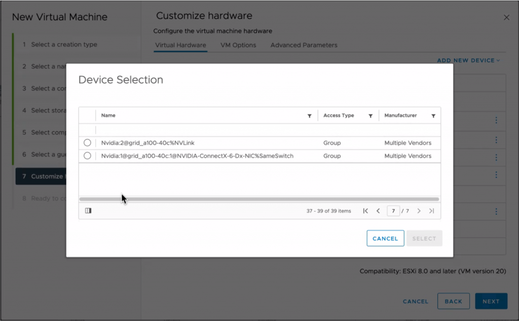 With Device Groups, vSphere 8 allows the VI-admin or MLOps team to create a configuration for workloads requiring multiple GPUs connected by a high-speed link or devices that must be on the same PCI switch.