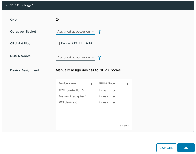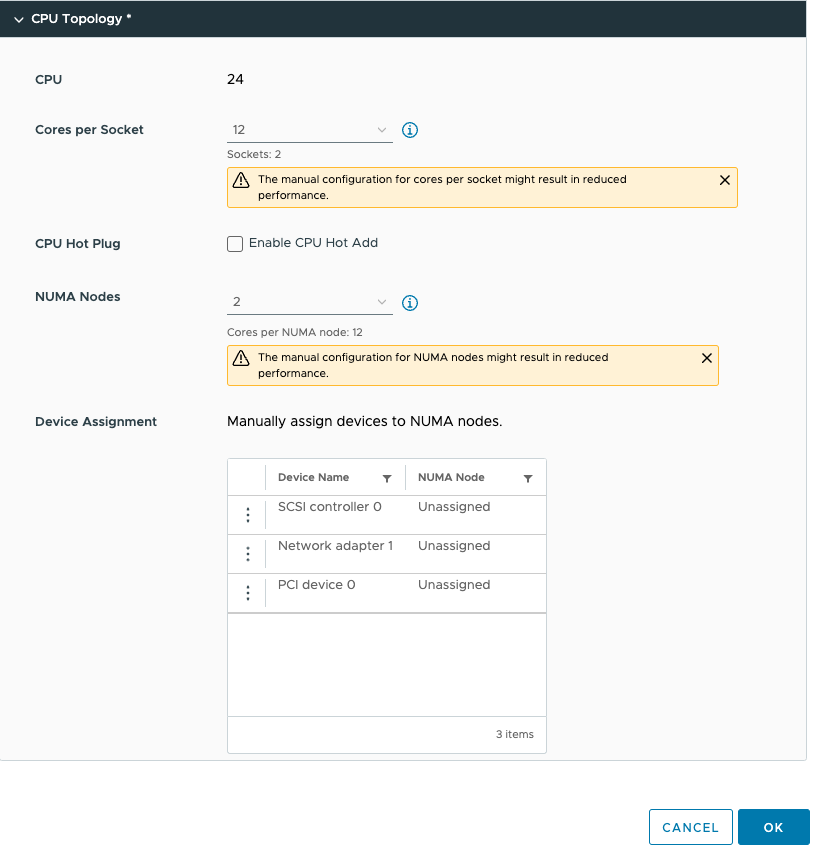By default, the Cores per Socket and NUMA Nodes settings are “assigned at power on” and this prevents you from assigning any PCI device to any NUMA node. To be able to assign PCI devices to NUMA nodes, you need to change the Cores per Socket setting. Immediately, a warning indicates that you need to know what you are doing, as incorrectly configuring the Cores per Socket can lead to performance degradation. Typically we recommend aligning the cores per socket to the physical layout of the server. In my case, my ESXi host system is a dual-socket server, and each CPU package contains 20 cores. By default, the NUMA scheduler maps vCPU to cores for NUMA client sizing; thus, this VM configuration cannot fit inside a single physical NUMA node. The NUMA scheduler will distribute the vCPUs across two NUMA clients equally; thus, 12 vCPUs will be placed per NUMA node (socket). As a result, the Cores per Socket configuration should be 12 Cores per Socket, which will inform ESXi to create two virtual sockets for that particular VM. For completeness’ sake, I specified two NUMA nodes as well. This setting is a PER-VM setting, it is not NUMA Nodes per Socket. You can easily leave this to the default setting, as ESXi will create a vNUMA topology based on the Cores per Socket settings. Unless you want to create some funky topology that your application absolutely requires. My recommendation, keep this one set to default as much as possible unless your application developer begs you otherwise.