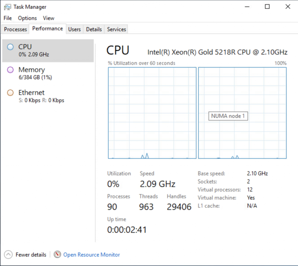 To check if everything has worked, I looked at the task manager of windows and enabled the NUMA view, which now shows two NUMA nodes.