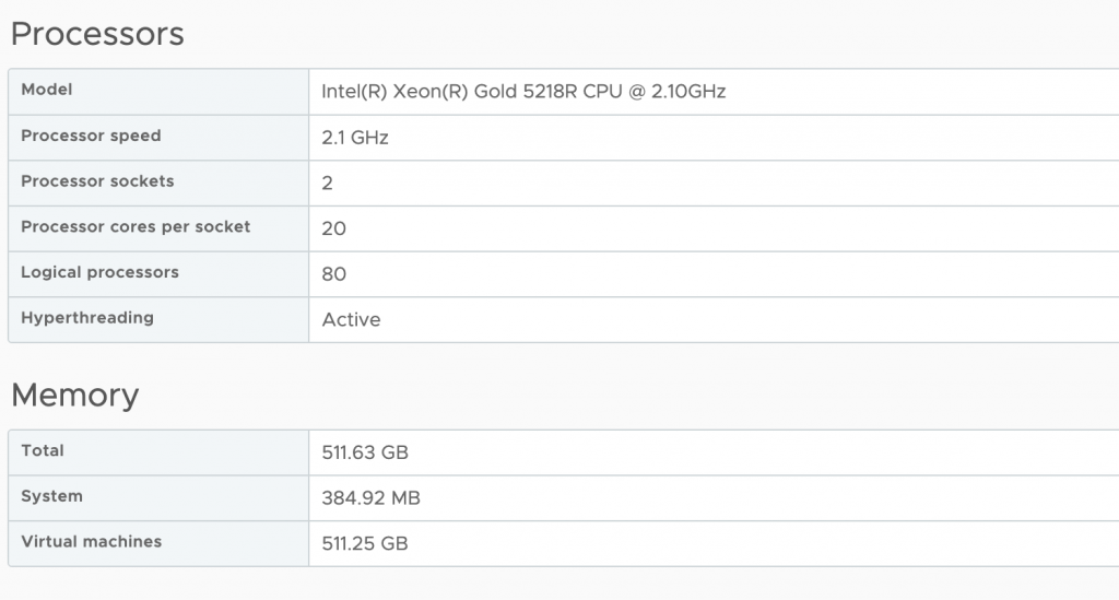 As a test, I’ve created a VM with 12 vCPUs and 384GB. The vCPU configuration fits a single NUMA node (12<20), but the memory configuration of 384GB exceeds the 256GB of each NUMA node.