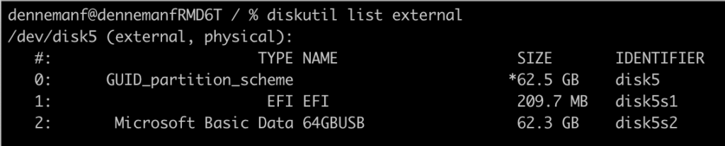 The option “external” only displays mounted volumes. This helps you to spot your USB drive easily. In my case, macOS assigned the identifier “disk5” to it. Note the disk name. We need that for our erasedisk command.