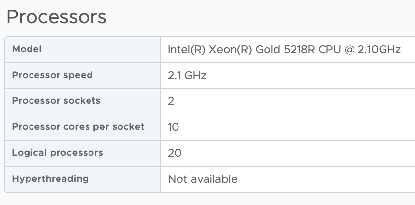 My physical ESXi hosts are equipped with Intel Xeon Gold 5218R CPUs, containing 20 cores per socket. The smallest ESXi host contains ten cores per socket in the environment I need to simulate. Therefore, I created a virtual ESXi host with 20 vCPUs and ensured that there were two virtual sockets (10 cores per socket)