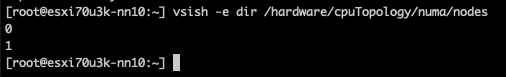 The vsish command vsish -e dir /hardware/cpuTopology/numa/nodes shows ESXi detects two NUMA nodes