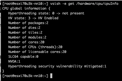 Let’s investigate, let’s start off by querying the CPUinfo of the VMkernel Sys Info Shell (vsish): vsish -e get /hardware/cpu/cpuInfo