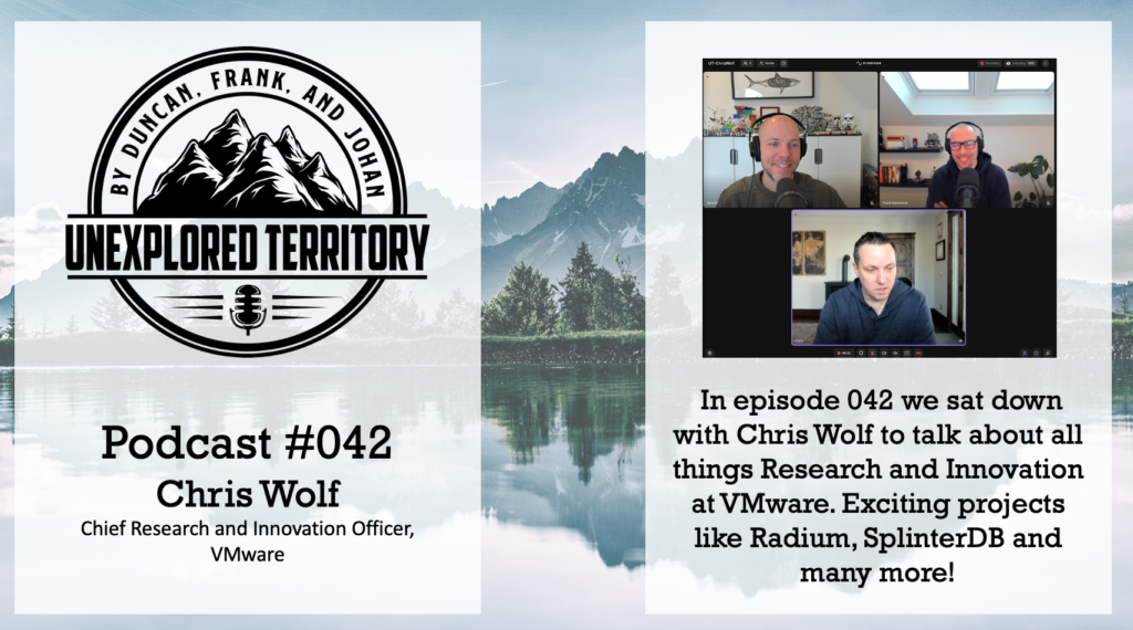 In episode 042 of the Unexplored Territory podcast, we talk to Chris Wolf, Chief Research and Innovation Officer of VMware, about innovation at VMware and exciting new research projects. Make sure to follow Chris on Twitter. Also, check the following resources Chris mentioned in the episode.