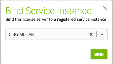 In the Bind Service Instance pop-up window that opens select the CLS service instance to which you want to bind the license server and click BIND. The Bind Service Instance pop-up window confirms that the license server has been bound to the service instance.