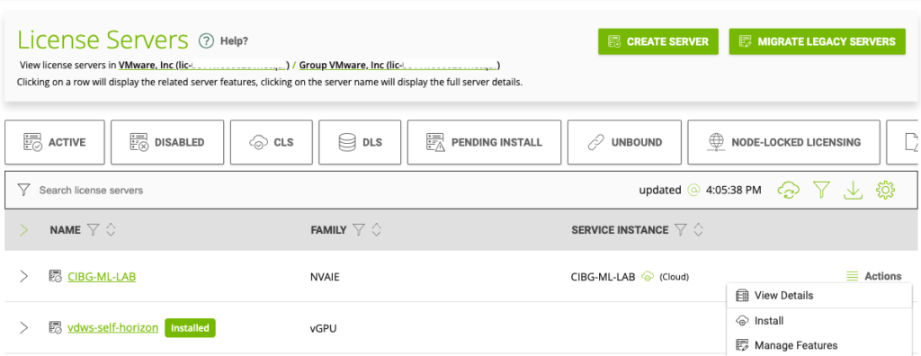 This step is necessary if you are using multiple CLS instances in your organization that is registered at NVIDIA and you are using the new CLS instance, not the default CLS instance for the organization. In the left navigation pane, expand LICENSE SERVER and click LIST SERVERS. Select your License Server, click on Actions, and choose Install.
