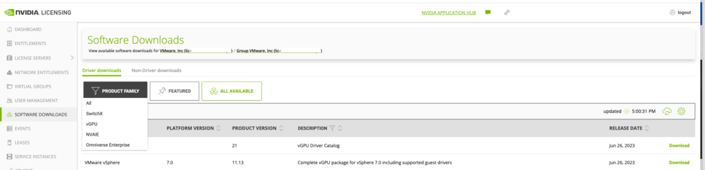 The vGPU driver is available at the NVIDIA Licensing Portal, part of the NVIDIA APPLICATION HUB. Go to the SOFTWARE DOWNLOADS option in the left menu, or go directly to https://ui.licensing.nvidia.com/software if logged in.