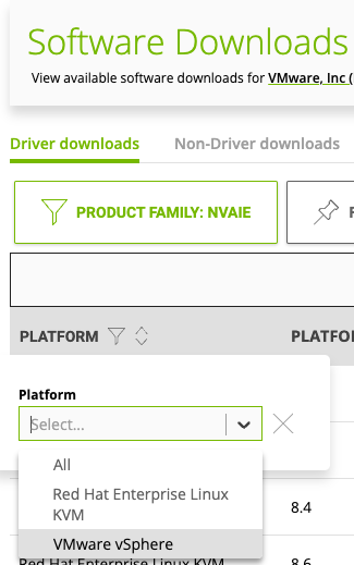 Two options look applicable: the vGPU product family and the NVAIE product family. For ML workloads, choose the NVAIE product family. The NVAIE product family provides vGPU capability for compute (ML/AI) workload. The vGPU family is for vGPU functionality for the VDI workload. You can recognize the correct vGPU Driver components with the NVD-AIE (NVIDIA AI Enterprise) prefix. To reduce the results shown on the screen, click PLATFORM and select VMware vSphere.