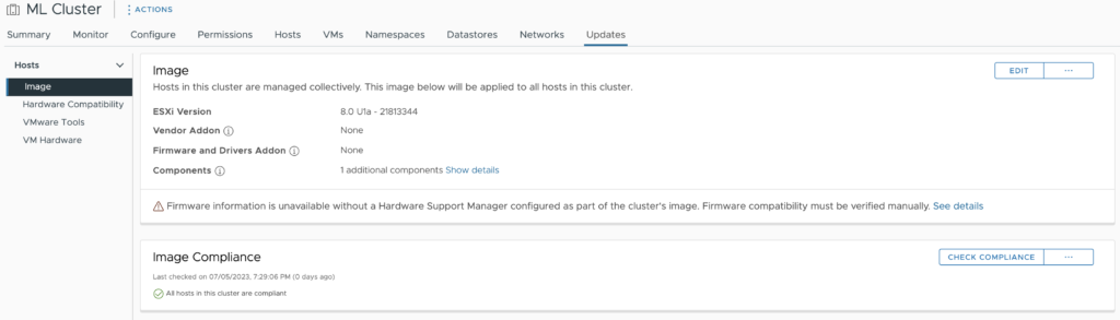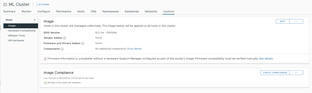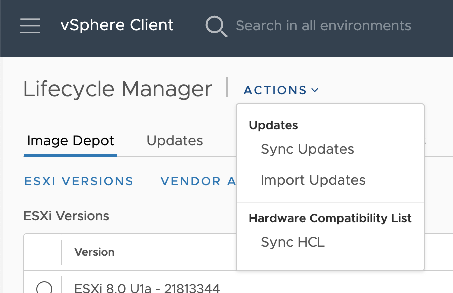 vSphere Lifecycle Manager (vCLM) integrates the NVAIE GPU driver with the vSphere base image to enforce consistency across the ESXi hosts in the cluster. To extend the base image, import the NVAIE GPU driver component by opening up the vSphere client menu (click on the three lines in the top left corner next to vSphere Client) select Lifecycle Manager, select ACTIONS, Import Updates.
