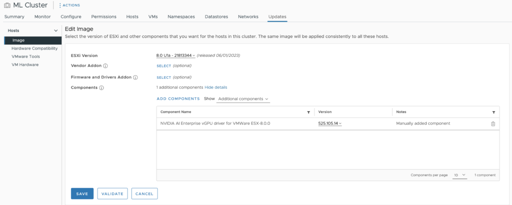 In the Image view, Click on EDIT, review the confirmation, and choose RESUME EDITING. Click on ADD COMPONENTS, add the NVIDIA AI Enterprise vGPU driver for VMware ESX-version number, and choose SELECT.